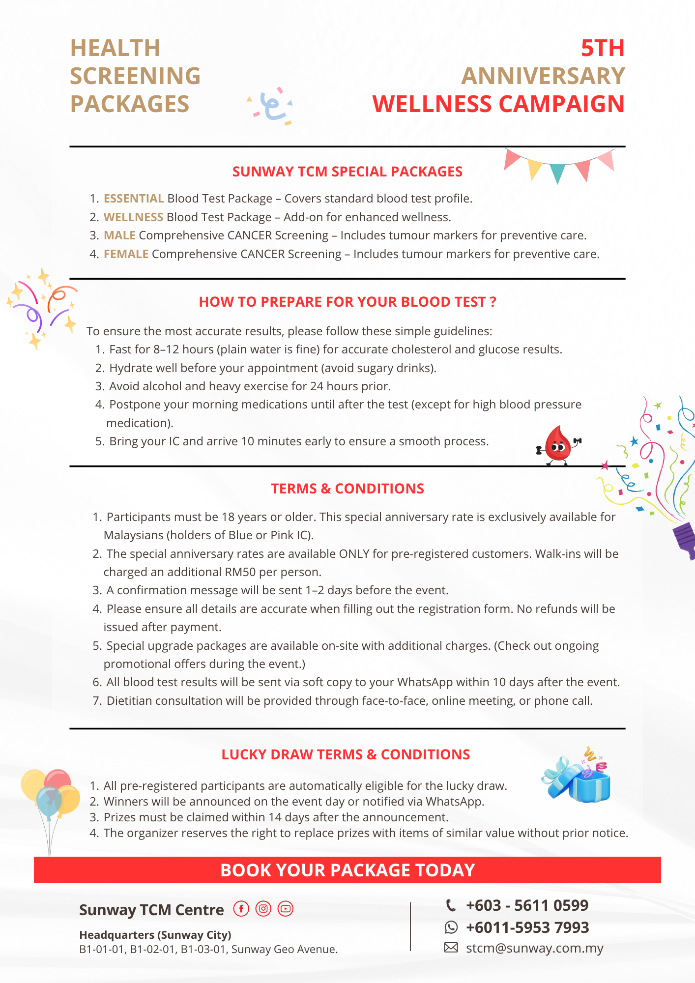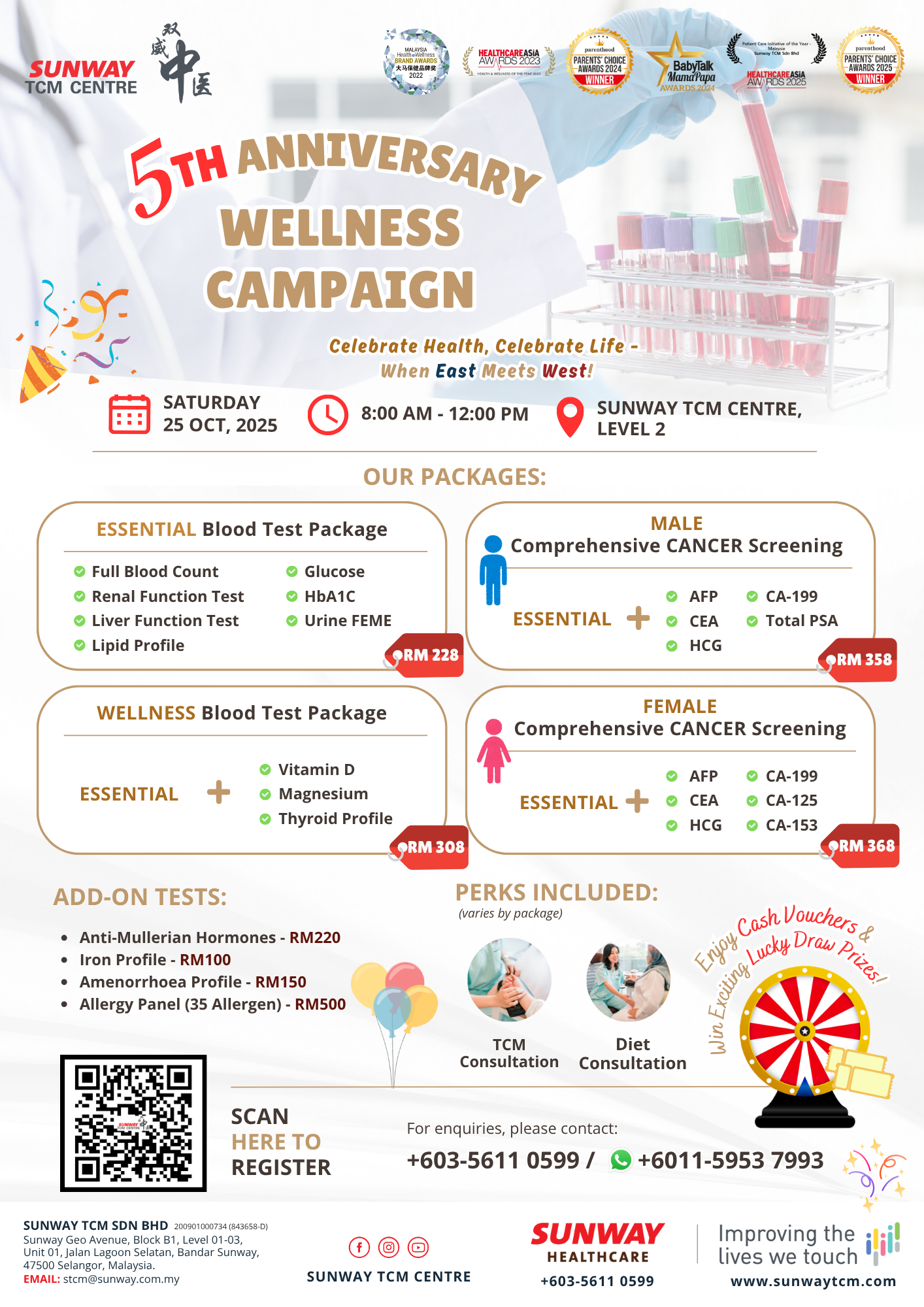 In celebration of our 5th Anniversary, Sunway TCM Centre is hosting a Wellness Campaign on 25 October 2025 (Saturday) from 8:00 AM – 12:00 PM at Sunway TCM Centre, Level 2.
