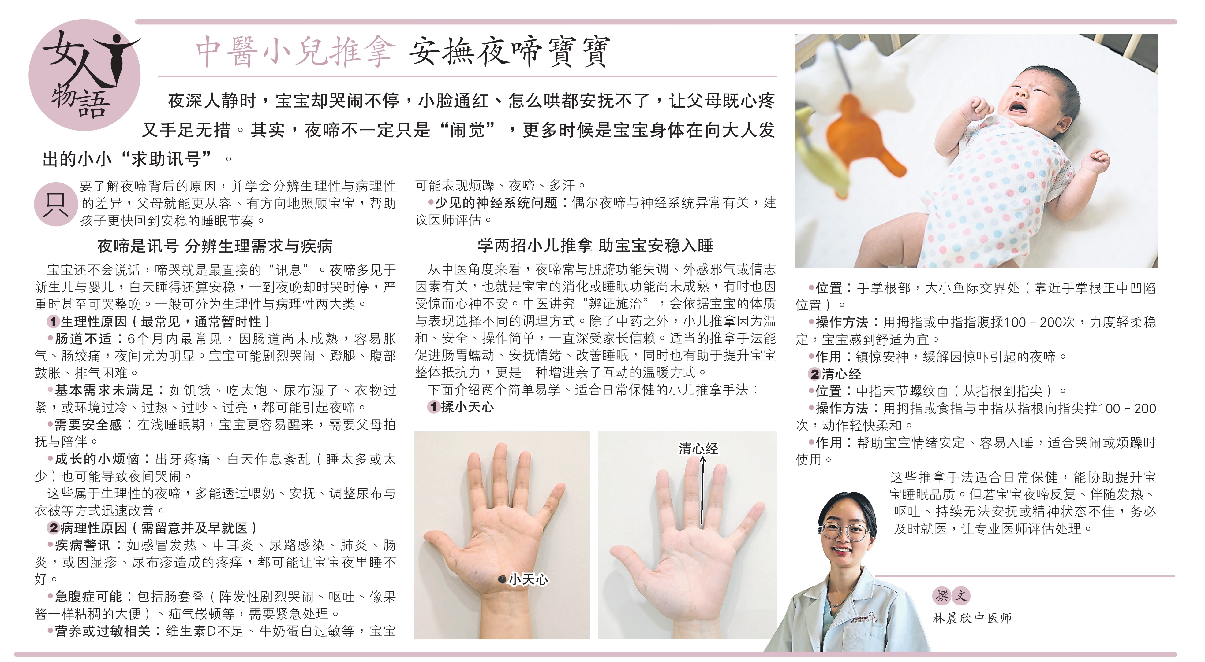 From a Traditional Chinese Medicine perspective, night crying relates to immature organ function, fright, or emotional unrest. Gentle pediatric Tuina techniques — such as Xiao Tian Xin rubbing and Qing Xin Jing stroking — can calm the mind, regulate digestion, stabilize mood, and promote better sleep while strengthening parent-child bonding.